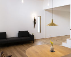 それにより内部空間も、勾配吹抜けを介して、LDK、寝室、洗面脱衣室、2Fホール、各居室が緩やかにつながり、どこにいても家族みんなをそっと包み込み守るような優しい空間となった。