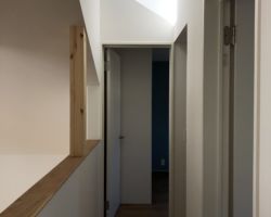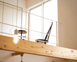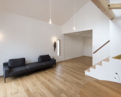 吹抜けは屋根勾配状に1Fと2Fを柔らかく緩やかにつなぐボリュームにして、高さをおさえることで、外観上でも街に対して威圧感を感じさせないひっそりした佇まいとなるように配慮した。