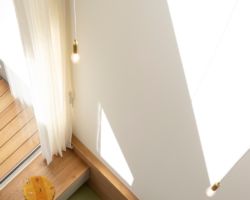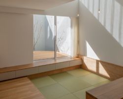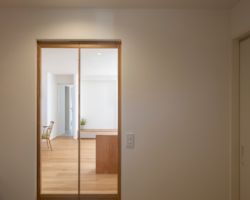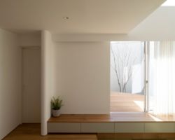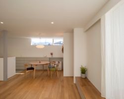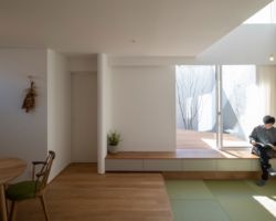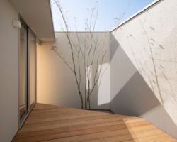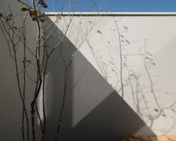 そこで、風よけと目隠しの役割を担う壁を計画し、四季の移ろいを感じれるコンパクトなプライベートコートを計画し、そこに隣接したLDKを配置した。